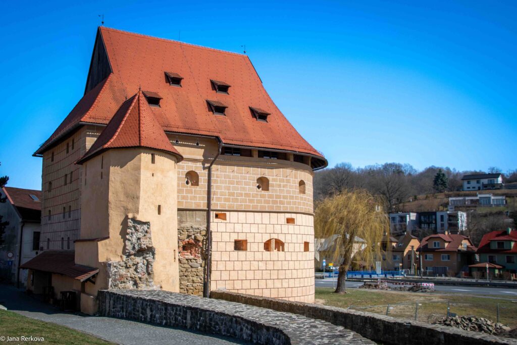 It’s a short but really enjoyable walk. On one side are the medieval defensive walls, and on the other beautifully restored town houses, hidden behind garden fences — and occasionally guarded by enthusiastic barking dogs. When you reach Prašná Bašta, take a moment to look at the miniature model of the town square nearby before either continuing along the walls or turning towards the historic centre.