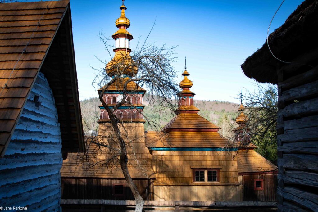 As you walk around the site, you’ll see wooden houses, farm buildings and everyday objects that show how people lived here in the 19th and early 20th centuries. One of the highlights is the beautiful wooden Greek Catholic Church of St. Nicholas, relocated here from the village of Mikulášová. Its dark timber structure and peaceful setting make it one of the most atmospheric spots in the entire complex.